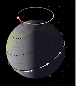 A shift in the direction the Earth’s axis points is called precession.  Over time the direction pointed toward by the Earth’s axis moves in the shape of a circle (see Fig. 3).  This type of motion is much like the wobble you see when a toy top starts to slow down. It takes about 23,000 years for the Earth to undergo one complete cycle of precession.  The Earth’s axis currently points toward Polaris, also known as the North Star.  That is the brightest star in the constellation Ursa minor (the little dipper).  As earth’s precession continues the direction of the axis will shift away from Polaris.  Be advised that precession alone does not change the tilt of Earth’s axis, only the direction it points.